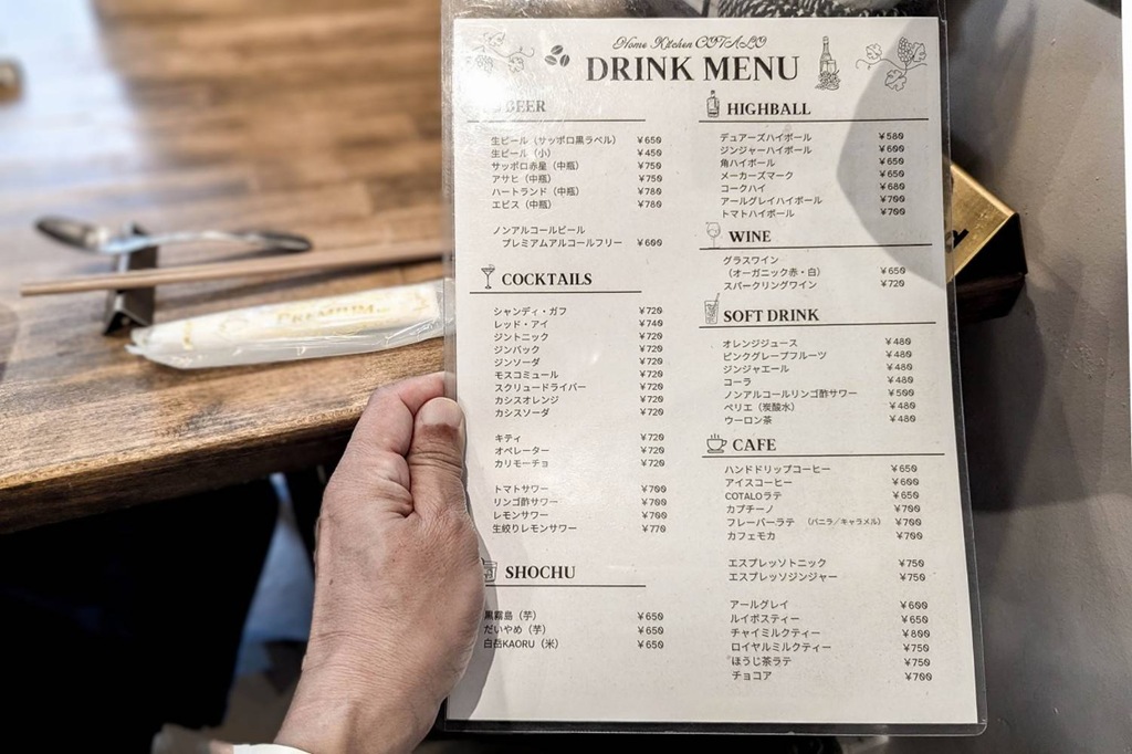 Home Kitchen COTALOのドリンクメニューは、ビールやハイボール、ワインに加え、カクテルや焼酎、カフェメニューまで幅広く揃った充実の内容です。
