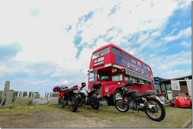 糸島の海岸線の道を走る道を野北から芥屋の方にちょっとだけ進むと、2階建てのバスが見えてきます。