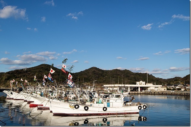 糸島 西浦漁港です。二見ヶ浦に近い漁港ですが、毎年漁船に大漁旗が棚引き青空に映えますね。