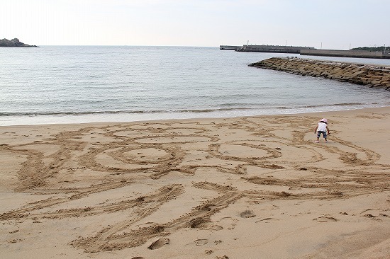 砂浜でお絵かきしてみました。超巨大なワンワンです。ここまで大きいの書くのは初めてかな。