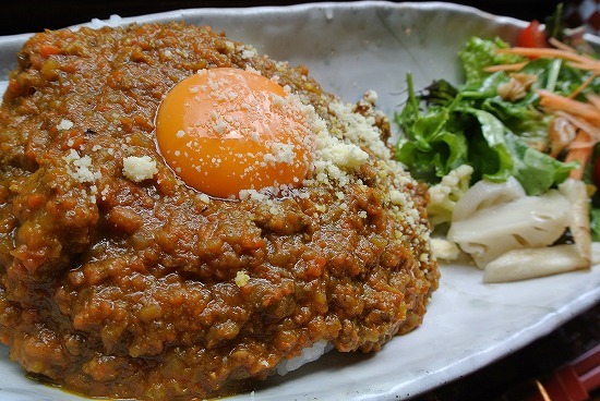 自分は結局本命のドライカレーを頂くことに。たまごの黄身とドライカレーがベストマッチで美味しかったですよ。野菜もついてくるし良い感じです。