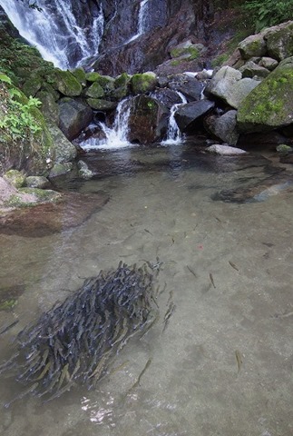 白糸の滝の、滝壺周辺では「やまめ」がご覧のような感じ、放されています。