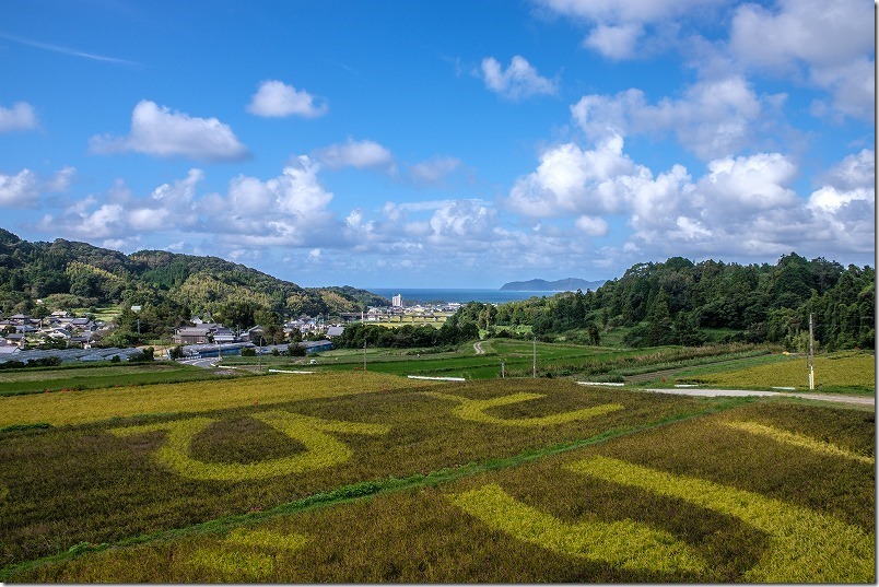二丈赤米生産組合が主催する田んぼアートです。夕日の時間帯が綺麗らしいですよ。