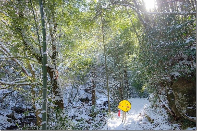 野河内渓谷への入り口付近の道路です。真っ白ですね。福岡だとあまり雪が積もらないので、ちょっと違う世界を見ている気分です。