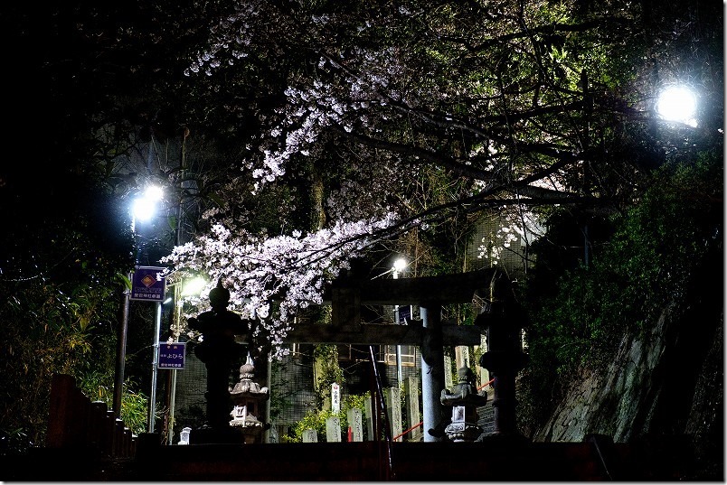 夜の神社ですが、ライトがたくさん灯いてて、なんか神秘的に桜が見えます。