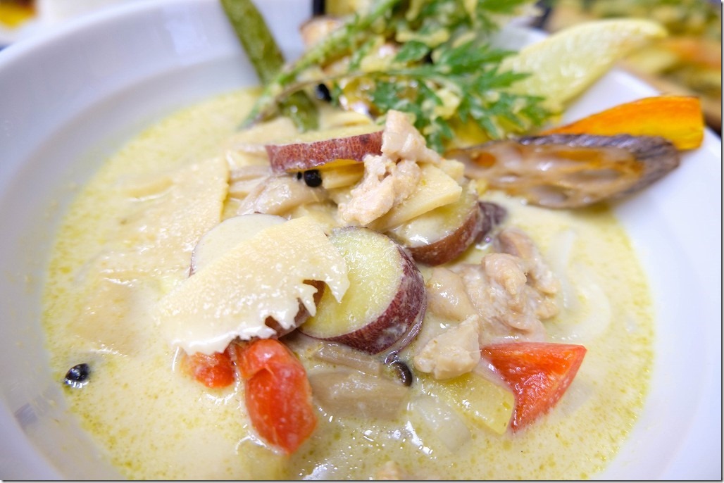 一緒に入ってる天ぷらも色とりどりで季節の野菜が使われていて美味しかったです。逆にこのへんは普通のグリーンカレーには入ってないかもですが、とっても合ってました。