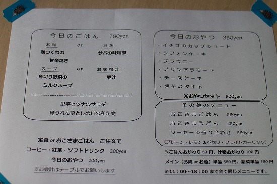 日替わりの定食と、おやつなどって感じです。リーズナブルにシンプルな感じのメニューです。