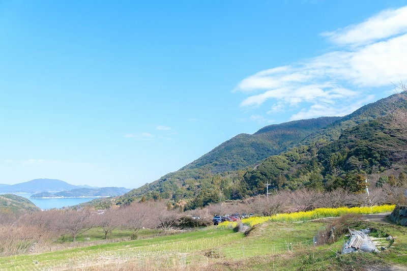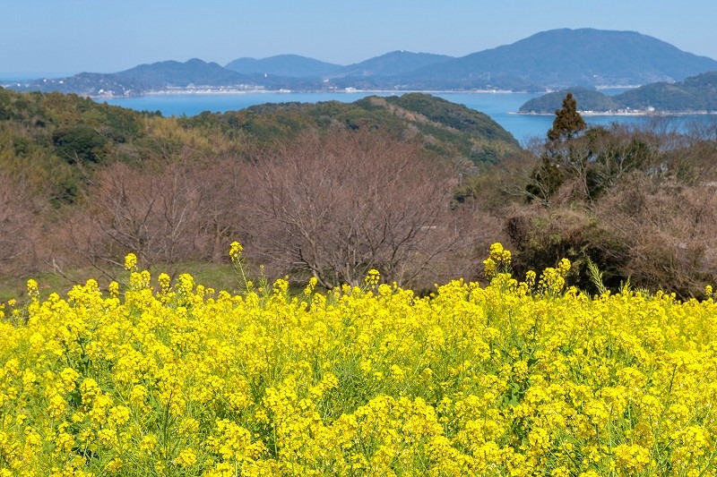 糸島 加茂ゆらりんこ橋の菜の花です。3月末~4月頭には桜と菜の花の共演が見られる景観スポットです。菜の花や桜のバックに糸島の海が広がるのも良いポイントです。