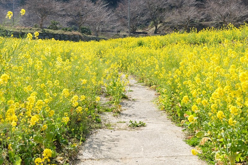 駐車場より上側に広がる菜の花畑は、中を歩いて通れる小道もできてます。こちらも時期になるとバックに桜があって更に綺麗なのだと思います。