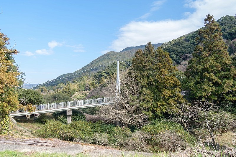 深江(きららの湯付近)と福吉(福ふくの里付近)の中間くらいの場所から山手に加茂ゆらりんこ橋はあります。