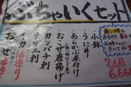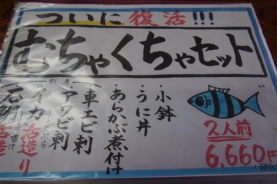 メニューはいろいろあるのですが、悩んだのは、この「むちゃくちゃセット」と下の「ぶちゃいくセット」です。共に二人前で6660円。