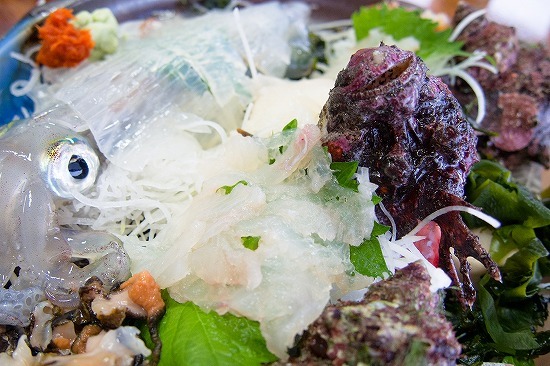 メインのおこぜとイカとサザエのお刺身です。かなりの食べごたえです。子供も入れて3人で食べましたが十分の量でした。イカもオコゼも生きてて子供はびくびくしてましたけど^^;