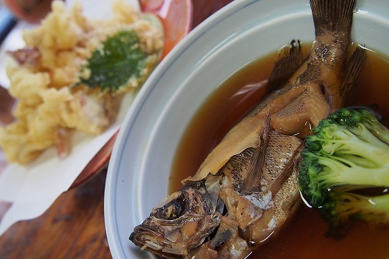 残ったイカは天ぷらに、オコゼは味噌汁にして貰いました。写真はあらかぶの煮付け?(実際にはメバルかな?)